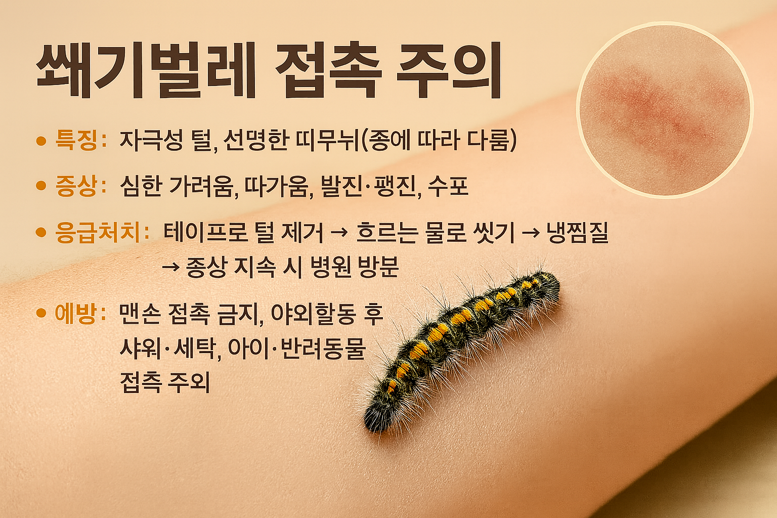 - 증상: 급성 가려움·홍반·팽진, 화상벌레는 선상 수포/미란