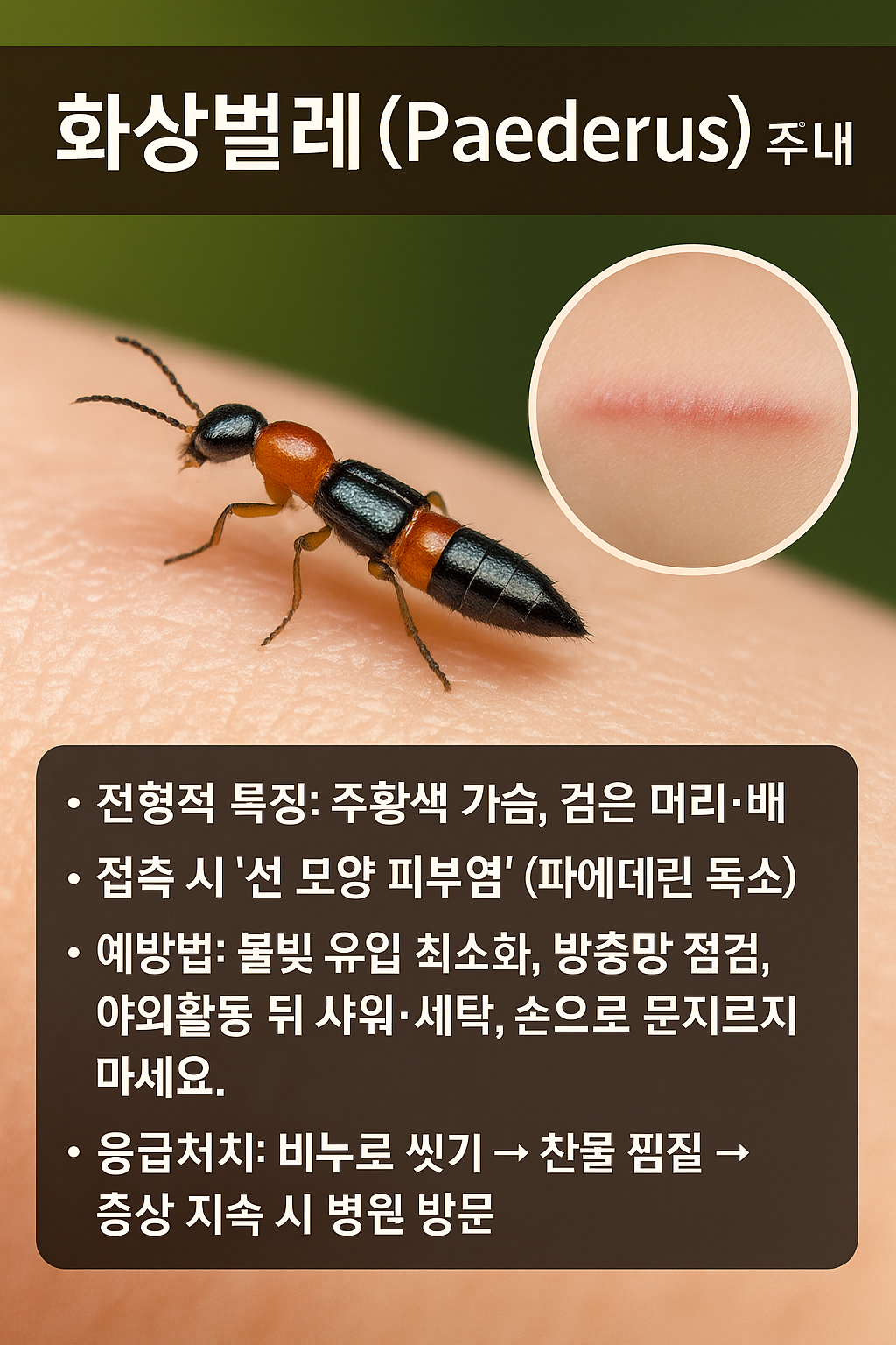 화상벌레(파데루스) | 초여름~가을 (대략 6~10월) | 비 온 뒤 습하고 야간 조명 많은 시기·장소에 급증 |