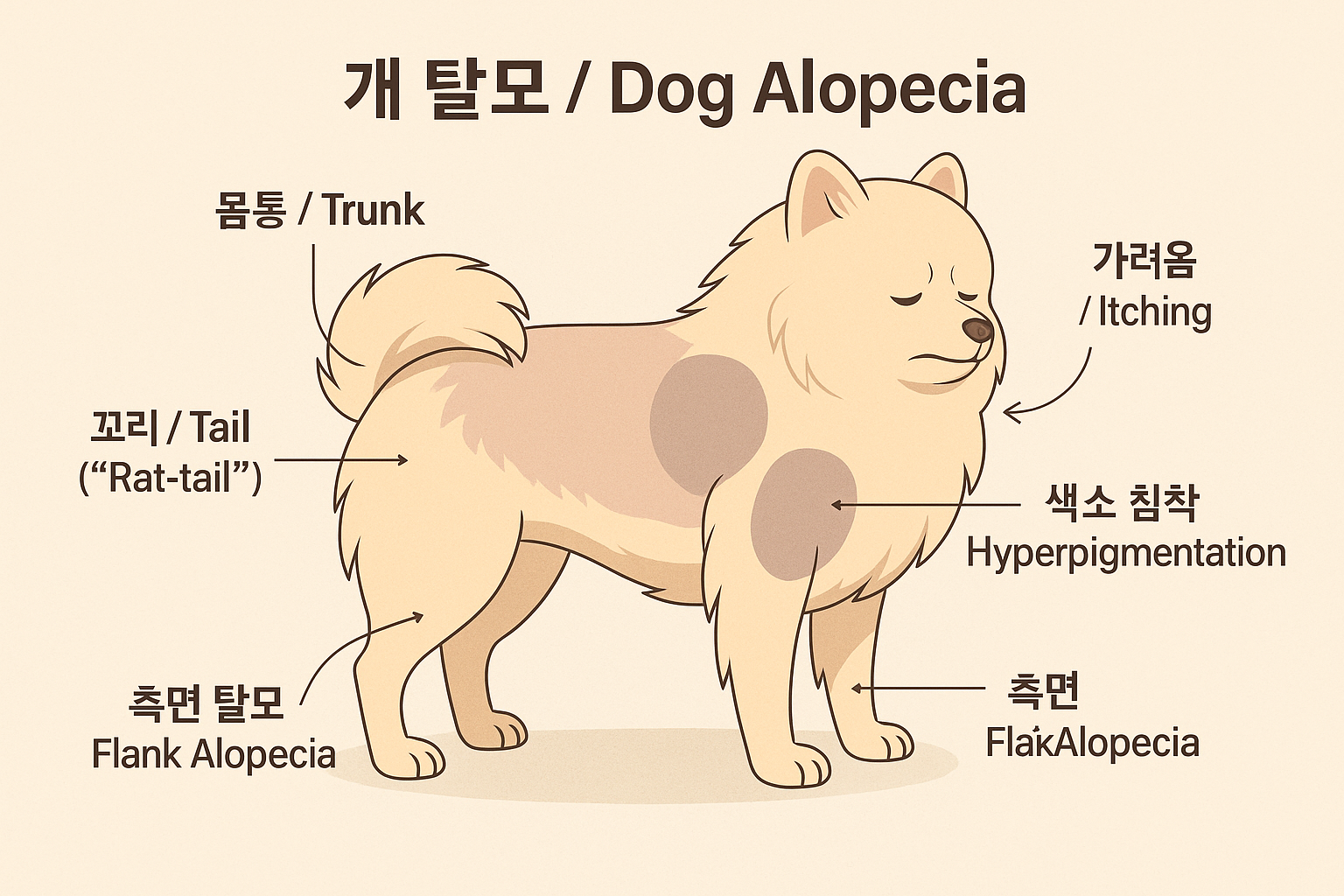 - 원인: 감염성·알레르기·내분비·유전성·행동 + 미용 후 탈모(클리핑·열·제품·견인·오염 도구·스트레스)