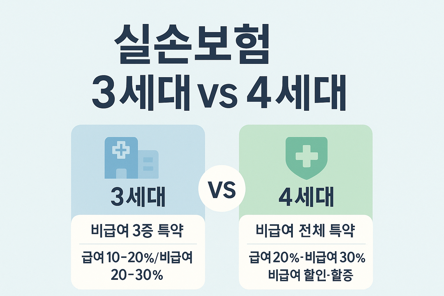 핵심 한 줄 요약: 3세대는 ‘비급여 3종’만 특약이고, 4세대는 비급여 전체가 특약입니다. 4세대는 보통 급여 20%·비급여 30%의 자기부담이 기본이며, 비급여 사용량이 다음 갱신 보험료에 반영되는 구조가 널리 쓰입니다(세부는 회사·상품별 상이).